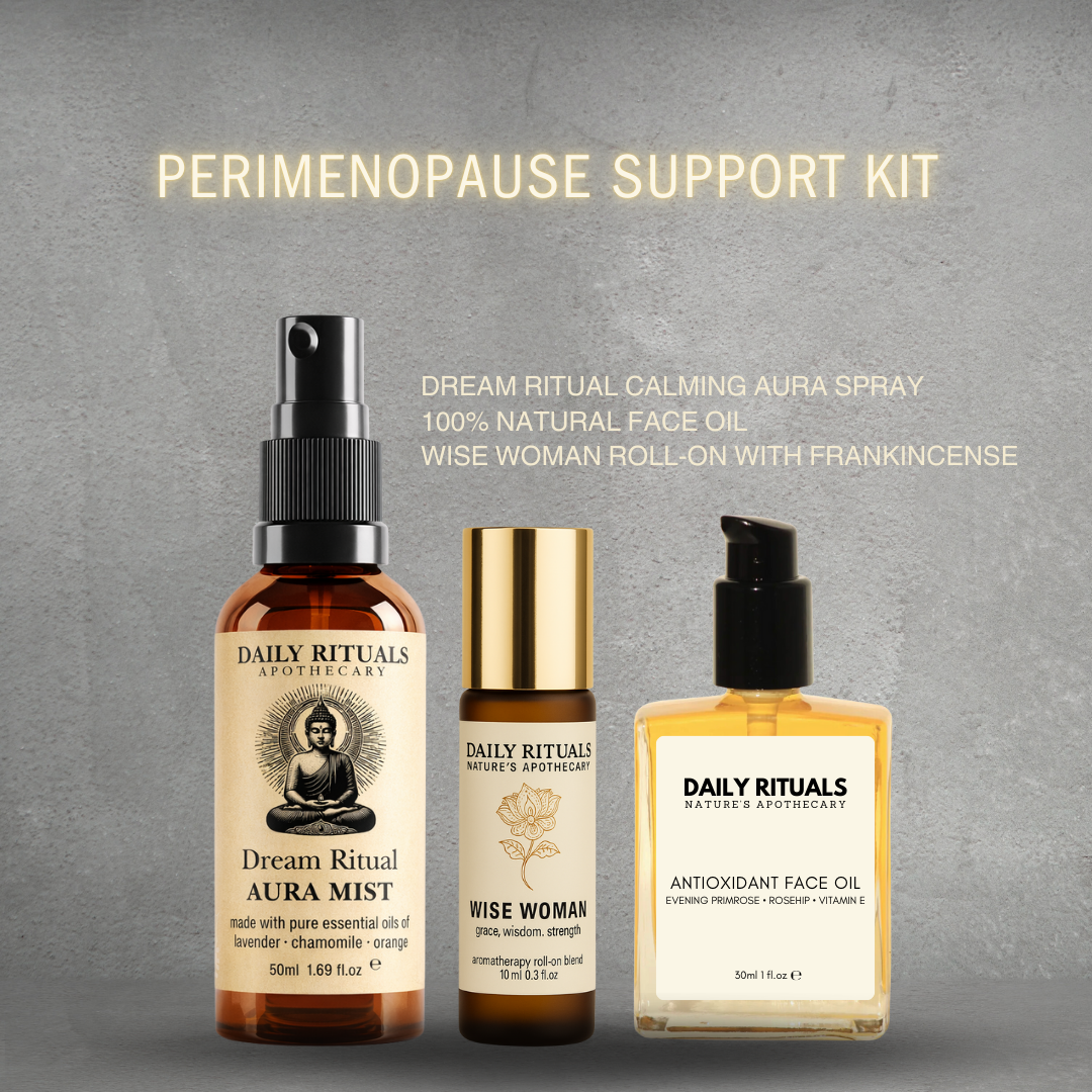 A thoughtfully curated trio designed to support you through perimenopause and beyond. When hormones feel unpredictable and your nervous system needs extra care, this kit brings together grounding aromatherapy, restful sleep support, and deeply nourishing skin care.